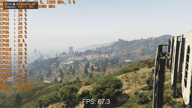 GTA V ma wbudowany benchmark, jednak nie jest on niestety zbyt dobry do testowania. Pomiędzy poszczególnymi krótkimi fragmentami testu znajduje się czarny ekran, podczas którego klatki skaczą do 300+. Gdybyśmy zostawili włączonego Frapsa przez cały czas trwania benchmarka, to wyniki w żadnym stopniu nie byłyby podobne do tego, co mamy podczas rozgrywki. W przypadku GTA musimy włączać Frapsa na początku testu, wyłączać na końcu i tak parę razy, co każdą mniejszą scenę w benchmarku. Dopiero taki zsumowany, uśredniony i powtórzony 5 razy wynik daje nam średni wynik FPS w benchmarku.