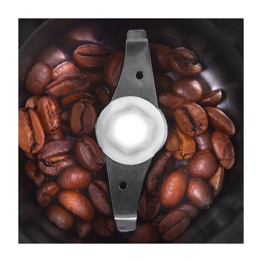 Elektryczny młynek o mocy 150 W dla miłośników aromatycznej, świeżo mielonej kawy. Pracuje cicho, z dużą szybkością i jest zabezpieczony przed włączeniem bez założenia pokrywki. Zaopatrzony w dwuskrzydłowy nóż ze stali nierdzewnej i przezroczystą pokrywkę. Pozwala zmielić na raz do 70 g szlachetnych ziaren.