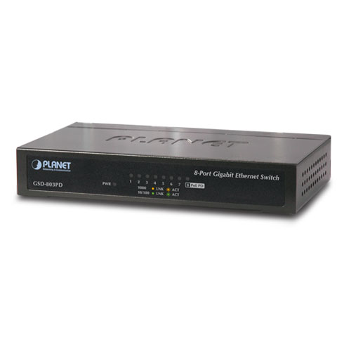 Planet GSD-803PD to funkcjonalny switch nowej generacji. Łączy w sobie oszczędność energii i prostotę obsługi. Jest to idealny switch do sieci domowych. ma parę przydatnych trybów pracy. Został wyposażony w wyłącznik pozwalający na całkowite wyłączenie urządzenia jak i pozostanie w trybie czuwania