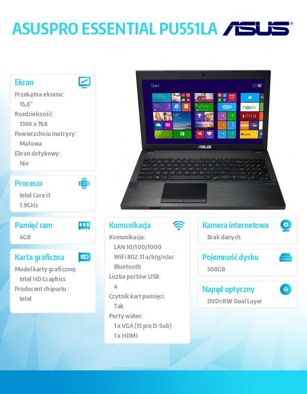 Specyfikacja Asus ASUSPRO ESSENTIAL PU551LA-XO164G Win8.1 Pro DP i3-4030U/4GB/500GB+8GB SSD/HD4400/8DL/15.6" HD AG Dark Gray