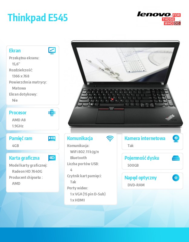 Specyfikacja Lenovo Thinkpad E545 20B20015PB DOS A8-4500M/4GB/GB/AMD Radeon HD Integrated/DVD Rambo/6c/15.6" HD AG,Midnight Black,N-WWAN/1Yr CI