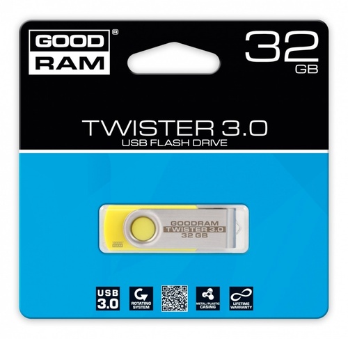 GoodRam TWISTER YELLOW 32GB USB3.0 to bardzo przydatna i kompaktowa pamięć flash, która da nam dodatkowe miejsce na nasze dane. Pojemność pamięci w tym modelu jest następująca: 32 GB.