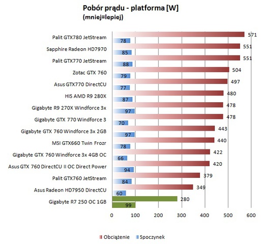 Testowana konstrukcja Gigabyte R7 250 OC jest przede wszystkim cicha. Temperatury pracy też można spokojnie zaliczyć na jej duży plus. Karta nie wymaga dodatkowego podpięcia do zasilania, więc i pobór prądu jest niewielki. Cały czar karty pryska, gdy porównamy ją z HD7770. Karty te dzieli niewielka różnica cenowa, a spora różnica wydajnościowa i choć R7 250 jest wydajniejsza od konkurencyjnej GT640, tak jej opłacalność zakupu moim zdaniem jest niska, właśnie z uwagi na różnicę do mocniejszego brata również ze stajni AMD.
