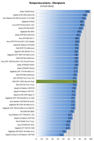 Niestety ale uboższy układ chłodzenia wypada gorzej od Gigabyte. Karta konkurencji to obecnie druga najchłodniejsza konstrukcja w stawce, tymczasem Palit otwiera środek stawki z różnicą aż 19stopni Celsjusza na niekorzyść dzisiaj testowanej karty pod obciążeniem. Na szczęście wyższe temperatury pracy karty nie przekładają się na wyższą głośność pracy układu chłodzącego. Tutaj obie konkurencyjne karty osiągnęły idealnie taki sam wynik 42dBA pod obciążeniem.
