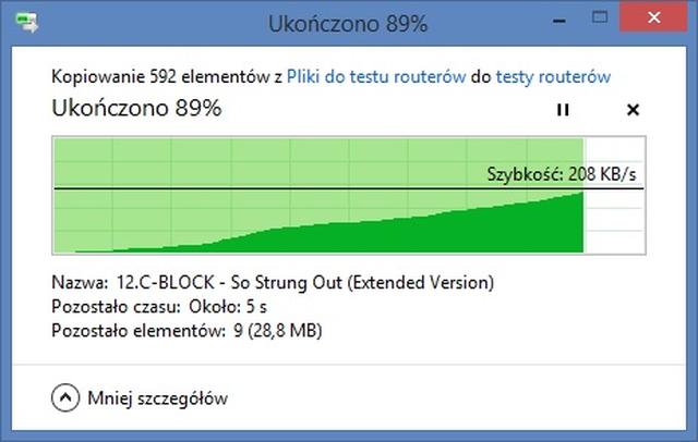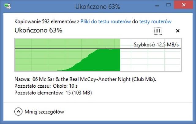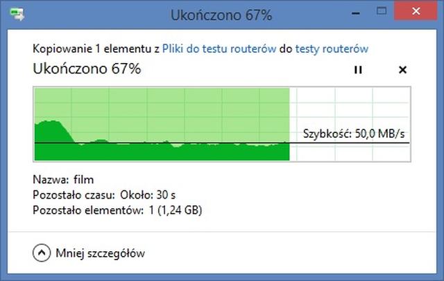 Testy polegały na kopiowaniu plików z jednego komputera na drugi oraz dysk USB.