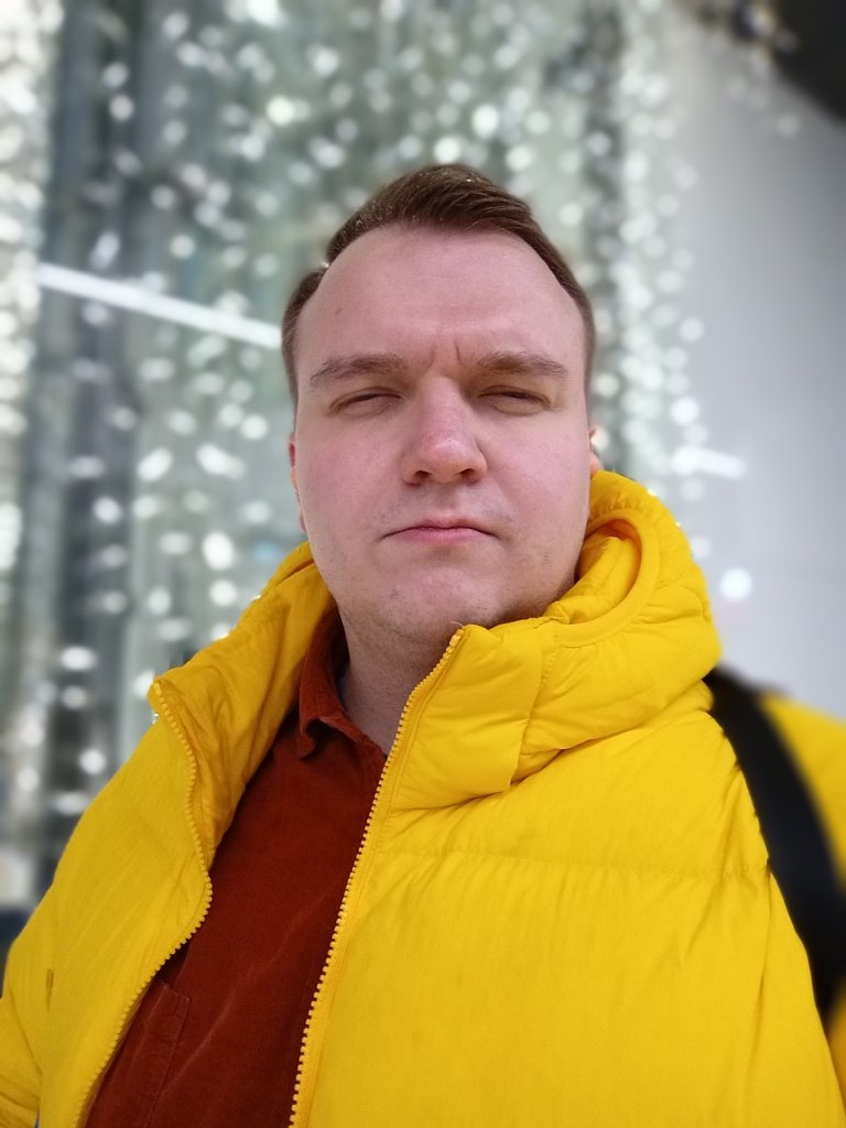 Przedni aparat radzi sobie w porządku, dopóki otrzymuje dużo światła. Co prawda kolorystyka cery jest nieco sina przez wybór niższej temperatury barwowej, ale nie jest to dyskwalifikujące i zdarza się tylko przy pochmurnych dniach. Dla równowagi szczegółowość wypada już odpowiednio dobrze. Rozmycie w trybie portretowym jest akceptowalne, gdy jest dobre światło i zbyt natarczywe w ciemnym oświetleniu. Szkoda, że rozpiętość tonalna ponownie nie jest na tyle dobra, by nie dochodziło do przepalenia tła.