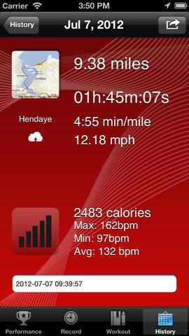 Każdy bieg jest monitorowany i zapisywany w historii. W nim jest mapka, która jest bardzo dokładna i pokazuje przebiegniętą trasę. Wypisane wszystkie statystkach w bardzo przejrzysty sposób. Możliwe jest także pochwalenie się wynikami na serwisach społecznościach. Jeżeli mam specjalną opaskę uciskową program będzie monitorował też ilość uderzeń na sekundę naszego serca.